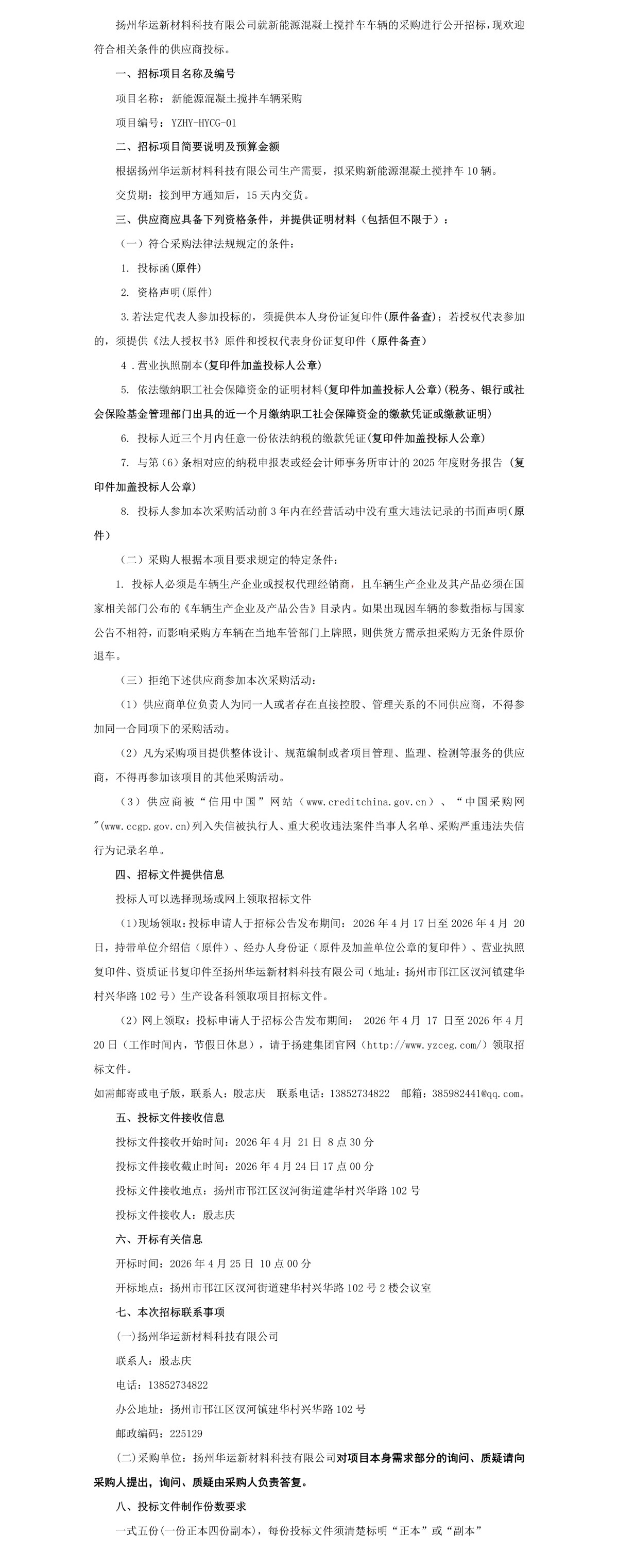 扬州华运新材料科技有限公司纯电动混凝土搅拌车辆采购公开招标